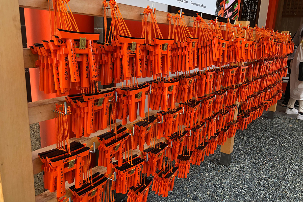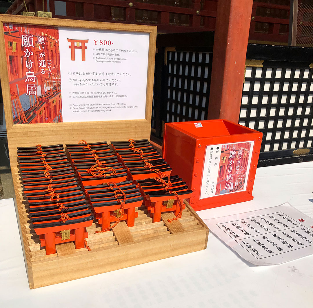 The shape of the ema varies from shrine to shrine, but the ema of Fushimi Inari Taisha is in the shape of a torii gate.