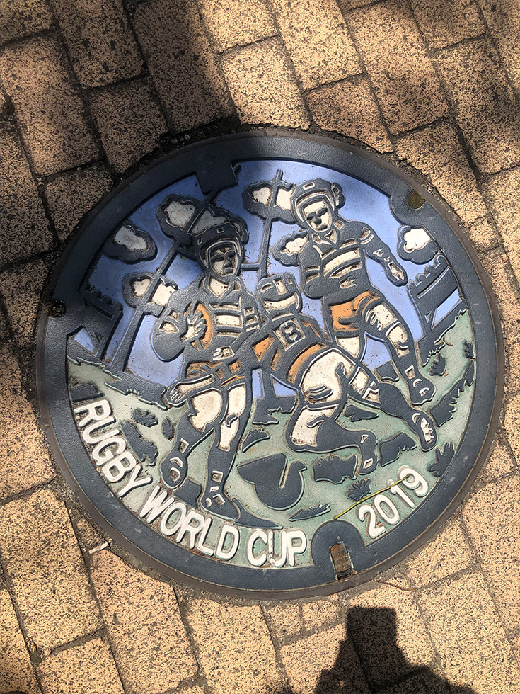 Here’s a manhole cover with a rugby illustration on it!
