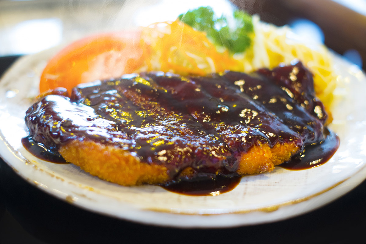 A dish of pork cutlet topped with a sweet and thick miso sauce. This dish goes very well with rice.