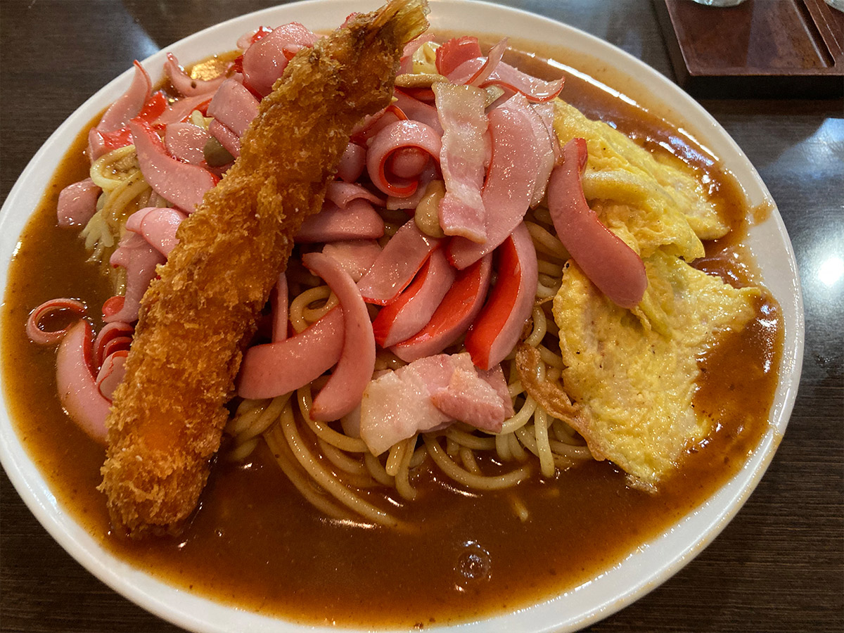 Thick, stir-fried spaghetti is covered with a tomato-based sauce that has just the right amount of meat and vegetable umami melted into it.