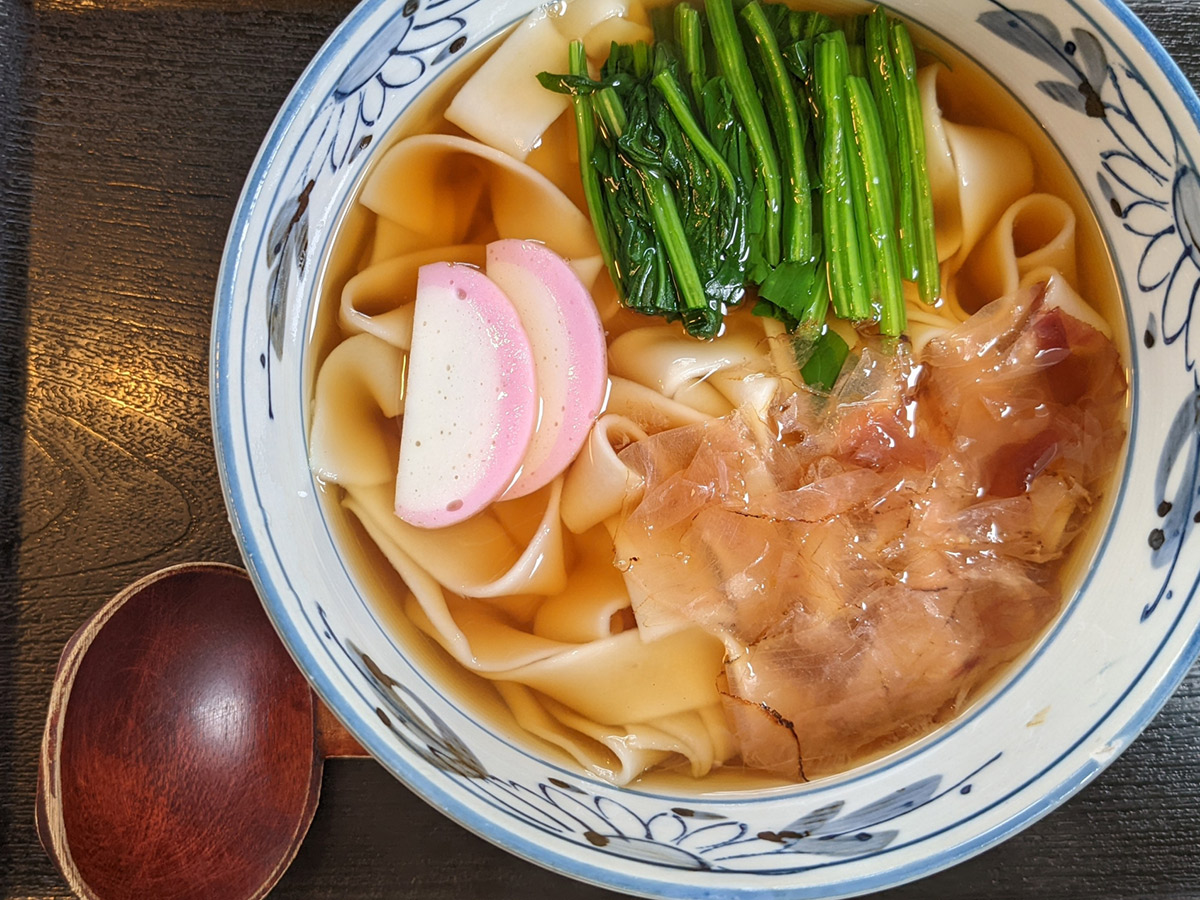 It is a food made of flattened and cut wheat flour noodles topped with warm soup stock.