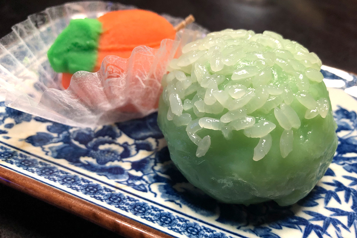 A sweet made by wrapping anko (sweet red bean paste) in colored rice cake, covering it with glutinous rice and steaming it.